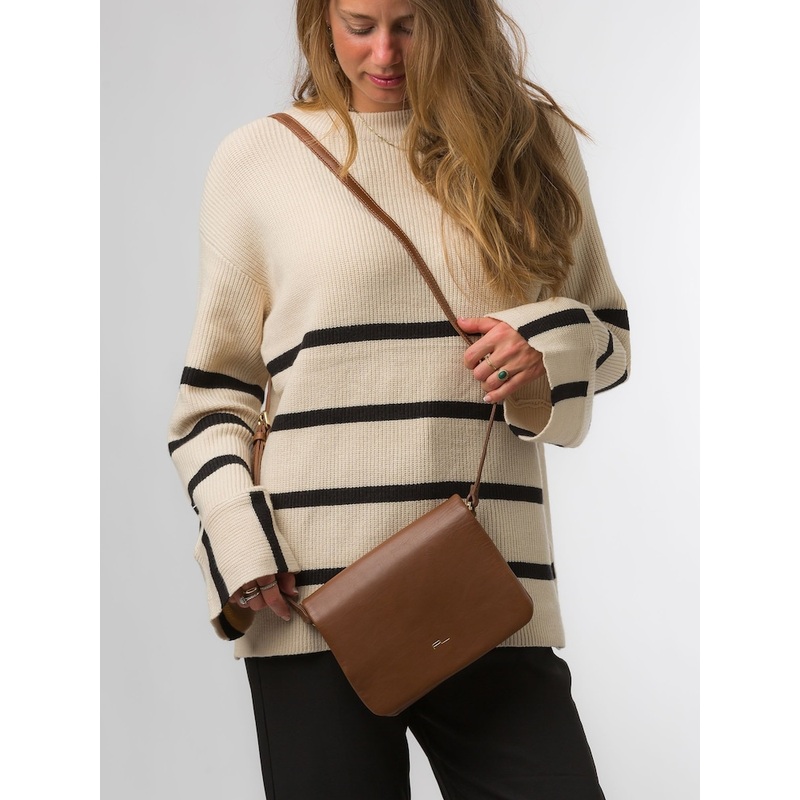The Ella cross-body bag in brown from Pure Luxuries London’s Knightsbridge Collection is handcrafted from gold standard Nappa leather with a super-soft and smooth finish. A fold-over top is secured with a magnetic press stud. The main compartment features two sections and a zipped pocket to help maintain an organised bag. Lined with 100% cotton for a flawless finish. A slip pocket on the rear of the bag is secured by a magnetic press stud. Features gold-coloured metal fittings and zips alongside the adjustable slim leather strap with a maximum drop length of 64cm. The minimalist Pure Luxuries logo is embossed in gold foil for a beautifully simple finishing touch. Height 16cm Width 22cm Depth 5cm Main 100% Leather. Lining 100% Cotton.