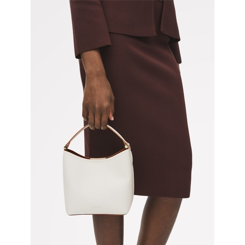 Functionality, style, and textured lizard-embossed leather this Bathurst Mews grab bag has it all. This top handle shape belongs on your arm during special events, whether its a summer wedding or a winter party. Crafted with contrast edge paint, high-shine hardware, and a detachable strap. Textured lizard-embossed leather. Contrast painted cut edges. Padded handle with bar hardware. Detachable crossbody strap. Magnetic fastening. Bonded faux suede lining. Interior pocket. Metal feet. Foil logo. Comes with a dust bag. Main 100% Leather. Lining 65% Cotton, 35% Polyester.