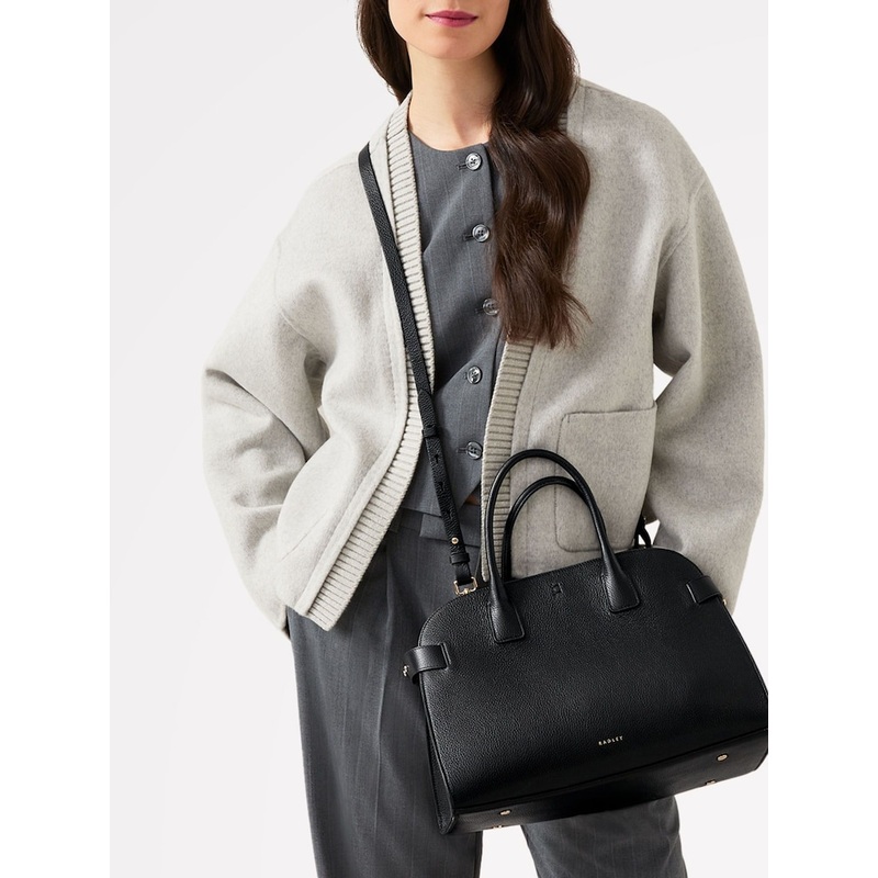 This is how Radley does smart, heritage style. With grained leather, belted tabs and side panelling. The Rathbone grab bag features all three, while the spacious faux suede-lined interiors and zipped pouch on a leather leash add the practicality you need for any busy schedule. Made with grained leather. V-shaped side panels and stitching. Adjustable belted tabs. Padded grab handles. Detachable cross body strap. D-ring tab closure. Bonded faux suede lining. Interior slip pocket. Interior zip-top pouch with card slots on leather leash. Metal feet. Foil logo. Comes with a dust bag. Height 23cm Width 33.5cm Depth 18cm Main 100% Leather. Lining 88% Polyester, 12% Elastane.