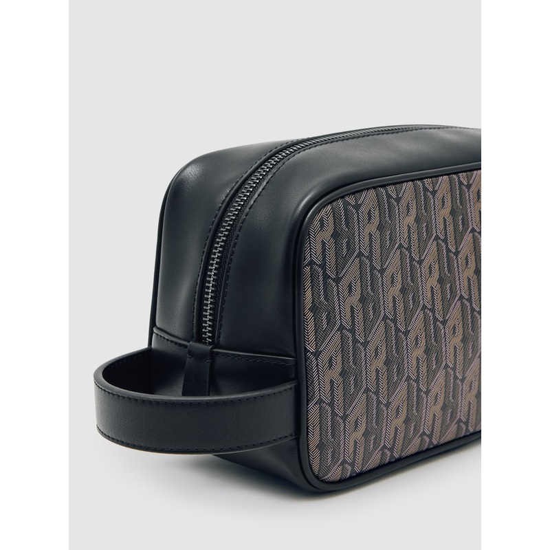 The Jones wash bag is crafted with durable coated canvas panels, elevated by a geometric R monogram pattern for a distinctive finish. A side carry strap offers easy portability, while a top zip fastening keeps essentials secure. Coated canvas panels. Monogram pattern. Small logo stamp. Zip closure. Height 13.5cm Width 24.5cm Depth 10cm 63% Polyurethane, 37% Polyester.
