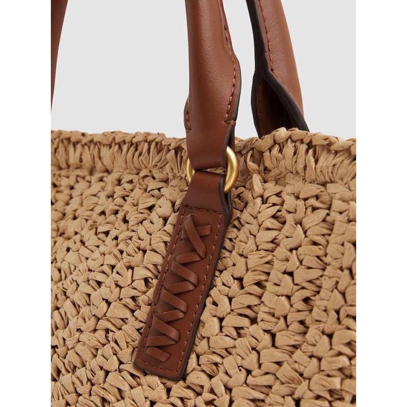 The Eden bag is the perfect summer tote, crafted from natural woven raffia and accented with faux leather trims for a touch of refinement. Rolled top handles and a detachable shoulder strap offer versatile carrying options. Raffia Faux leather trims Rolled
