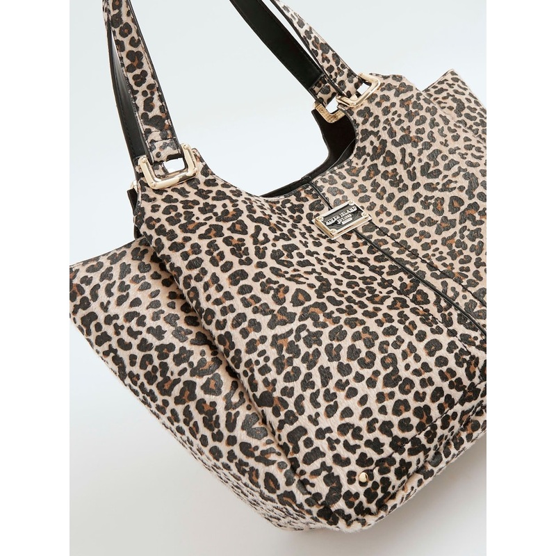 Leopard print Shoulder straps Winged design Branding detail Popper fastening Handle drop: 25cm H: 27.5cm x W: 42cm x D: 16cm Depth 16cm 100% Polyester.