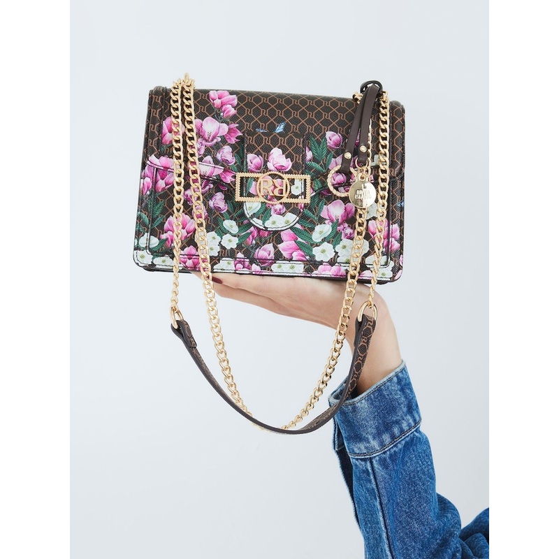 Morgan collection RI monogram and floral print Chain shoulder strap Internal zipped compartment Gold RR branding Front flap closure Popper fastening Dimensions: H: 15cm, W: 22.5cm, D: 8cm Depth 8cm 100% Cotton.