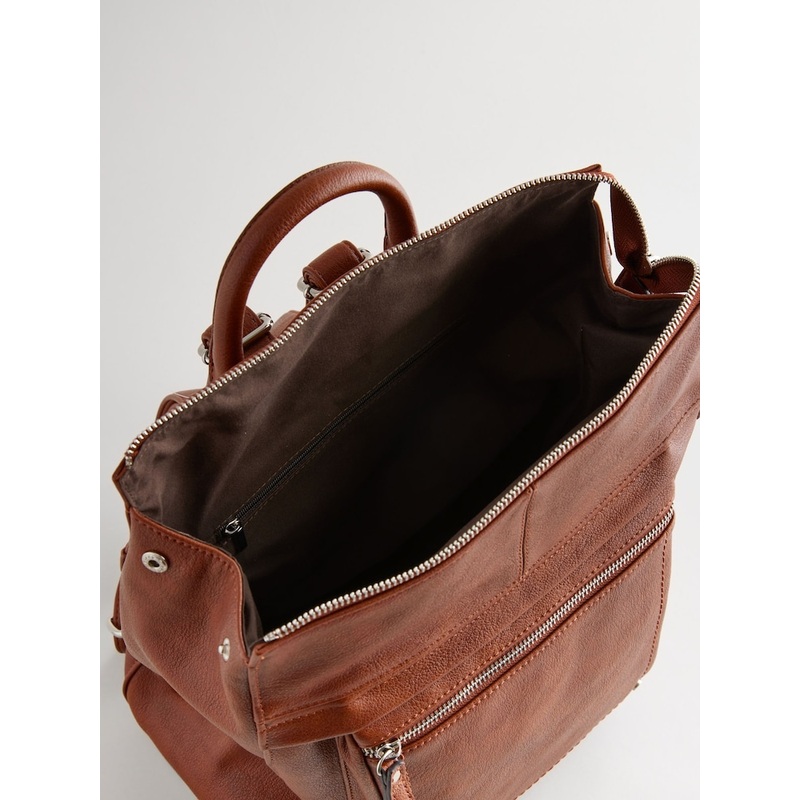 In a vintage-inspired messenger style, this stylish tan brown backpack is made from a soft faux leather with a zippered front pocket, a main pocket and an internal zippered compartment for your valuables, finished with a carrying handle and two adjustable shoulder straps. Faux leather Zippered front pocket Zippered main compartment Carrying handle Adjustable straps Height 36cm Width 30cm Depth 11cm Outer 100% PU. Lining 100% Recycled polyester.