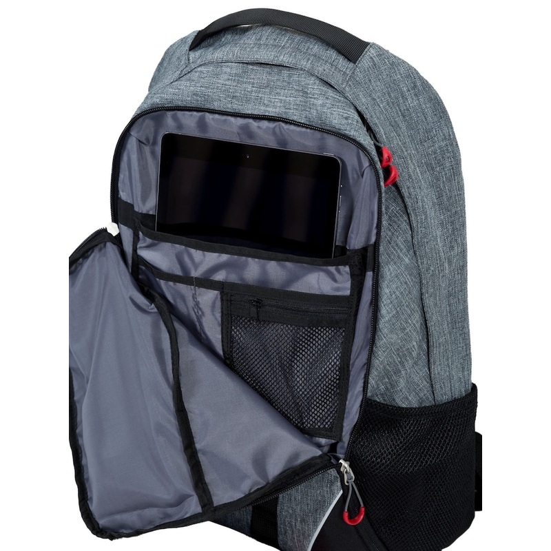 35 Litre Backpack. 3 Zip Sections. Padded Back And Shoulder Straps. Laptop Compartment. Dual Stretch Mesh Pockets. Carabiner Clip. Attachment Loops. Shell 100% Polyester, Shell. and Lining 100% Polyester. Outer 100% Polyester.