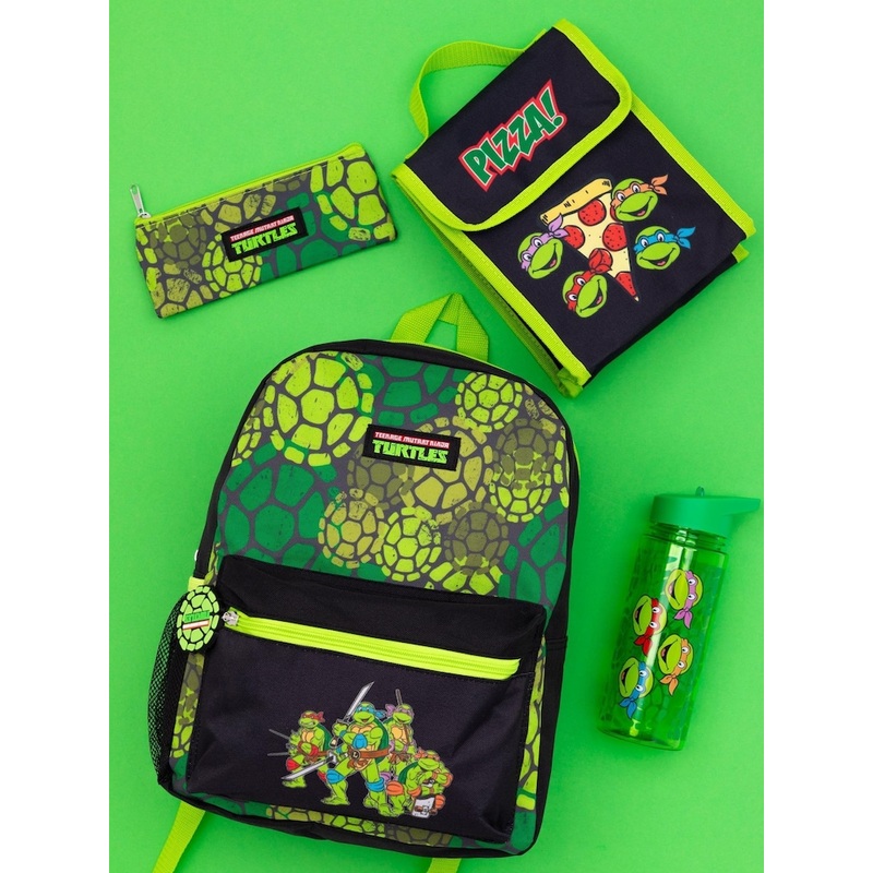 Get them ready to join the Teenage Mutant Ninja Turtles in their latest adventure. Then look no further than this epic 4-piece backpack set!With Donatello, Raphael, Michelangelo and Leonardo ready for action, they’ll have all the help they need to make their school day and adventures more magical than ever. This backpack is sure to turn heads wherever they go, featuring a black and green design with an all-over print of the turtles’ iconic shells. And with a lunch bag that showcases the TMNT’s favourite food – pizza! But that’s not all – this set also comes with a water bottle and pencil case, so they can keep all their stationery organised and within reach.Product DetailsSet Includes: Backpack – with main zip compartment, mesh bottle holder, front zip pocket, adjustable straps Measures approximately 36x26x12cm Lunch Bag – Insulated with a carry handleMeasures 21x20x9.5cm Pencil Case measures 20x8cm 500ml Water Bottle BPA Free Materials – Bag, Lunch Bag & Pencil case are constructed from 100% Polyester 50% Polyester, 50% Plastic.