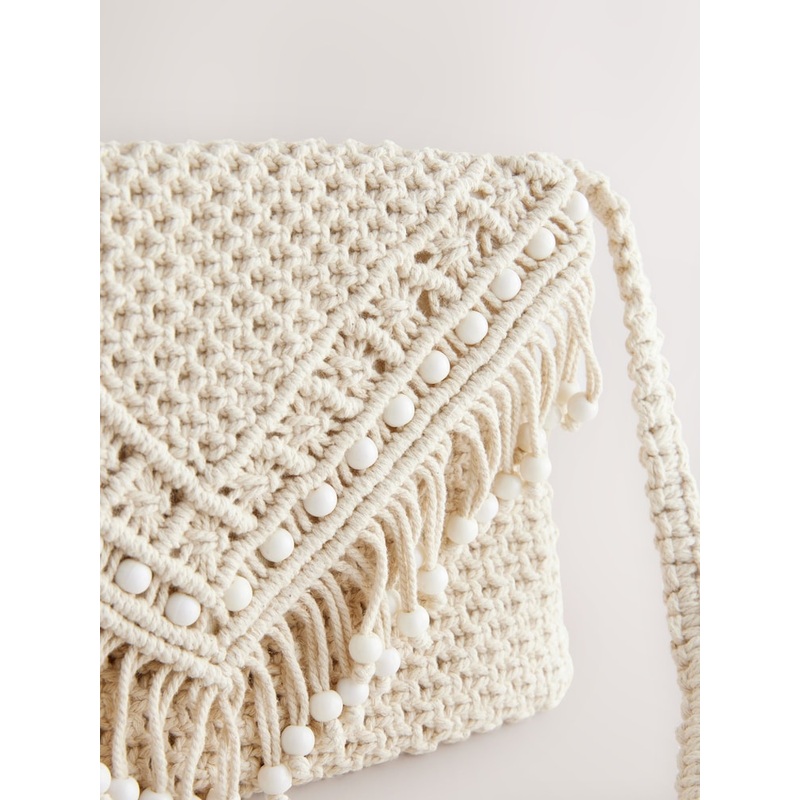 This cross body bag has a summery look, made with a macrame woven design with beaded detailing and a shoulder strap, finished with a main storage compartment and a soft fabric. 100% cotton Macrame design Beaded detailing Crossbody shoulder strap Height 20.5cm Width 27.5cm Depth 1.5cm Main 100% Cotton. Lining 100% Cotton.