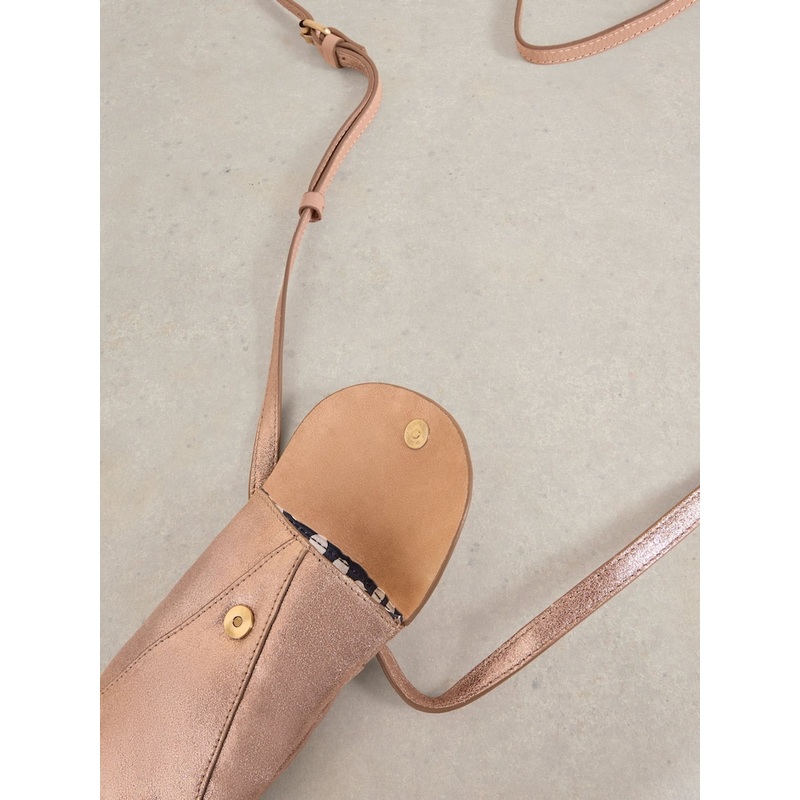 A new shape for a phone bag, featuring a metal pop-in closuremore minimal and straightforward than our buckle Clara. Finished with an adjustable strap for versatile styling. Height 19cm Width 11.5cm Main 100% Leather. Lining 100% Cotton.